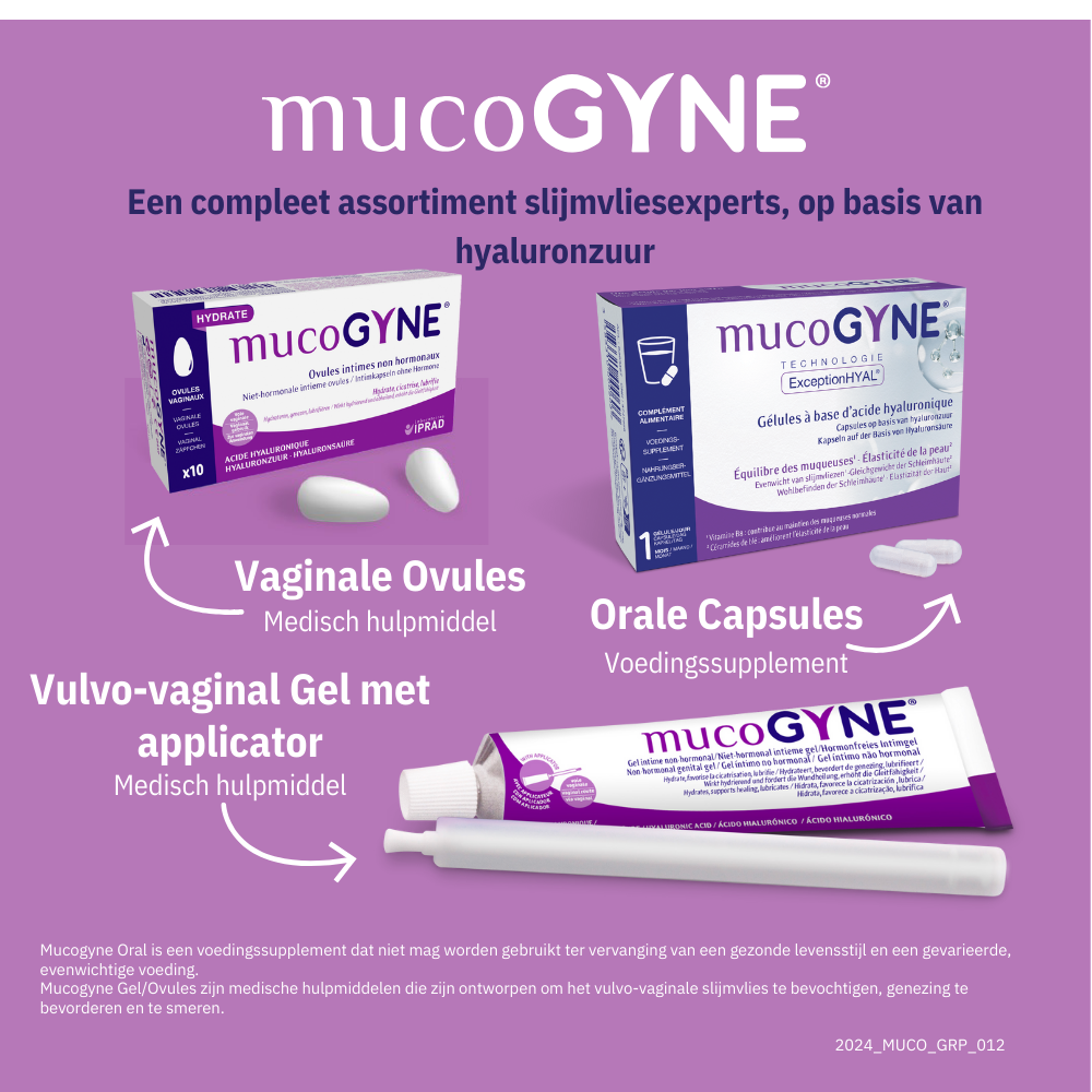 Capsules op basis van hyaluronzuur, gemakkelijk en snel in te nemen met een glas water. Te gebruiken op zichzelf of als aanvulling op Mucogyne Gel/Ovules, onder andere aanbevolen bij vaginale droogheid.